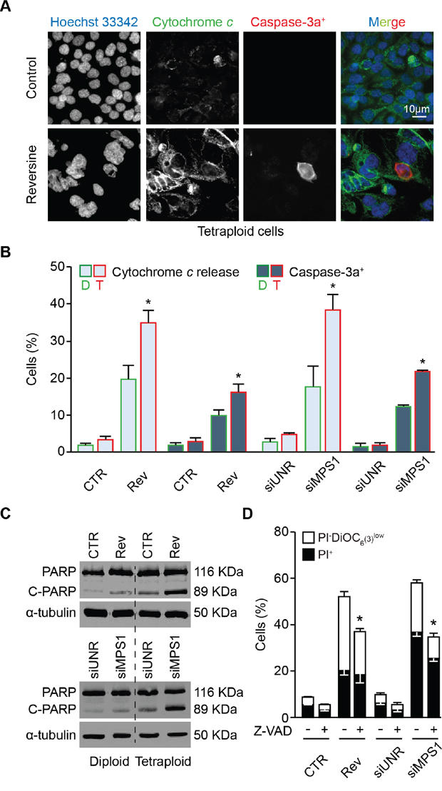 Figure 6: Mechanisms of cell death induced by MPS1 abrogation. A. and B. Diploid and tetraploid human colorectal carcinoma HCT 116 cells (framed in green and red, respectively) treated or not with 0.3 μM reversine (A and B) or transfected with an unrelated small interfering (si)RNA (siUNR) or a specific siRNA directed against MPS1 (siMPS1) for 72 hours (h) (B) were stained to visualize cytochrome c (green fluorescence), activated caspase-3 (caspase-3a+, red fluorescence) and nuclei (Hoechst 33342, blue fluorescence) and analyzed by fluorescence microscopy. The percentage of cells exhibiting diffuse (as opposed to punctuate) cytochrome c staining or caspase-3 activation was determined as described in Materials and Methods. Representative fluorescence microphotographs of tetraploid cells (A) and quantitative results (means ± SEM, n = 3) for both diploid and tetraploid clones (B) are shown. *p < 0.001 (Mann–Whitney test), as compared with diploid cells subjected to the same treatment or transfection condition. C. Western-blot analysis of protein extracts from diploid and tetraploid HCT 116 cells treated or not with 0.3 μM reversine or transfected with siUNR or siMPS1 for 72 h using an antibody directed against poly (ADP-ribose) polymerase (PARP) and recognizing the cleaved (C-PARP, 89 KDa) and uncleaved (PARP, 116 KDa) forms. Alpha-tubulin was used to verify equal loading. D. Tetraploid HCT 116 cells were treated or not for 72 h with 0.3 μM reversine or transfected with the indicated siRNAs alone or in combination with 25 μM Z-Val-Ala-Asp-fluoromethylketone (Z-VAD-fmk, abbreviated as Z-VAD), followed by co-staining with DiOC6(3)/propidium iodure (PI) and cytofluorometric analysis. White and black columns illustrate the percentage of dying (PI−DiOC6(3)low) and dead (PI+) cells, respectively. Data are reported as means ± SEM (n = 3). *p < 0.001 (Mann–Whitney test), as compared with cells subjected to the same treatment or transfection condition but not exposed to Z-VAD. CTR, control; diploid, D; tetraploid, T; reversine, Rev.