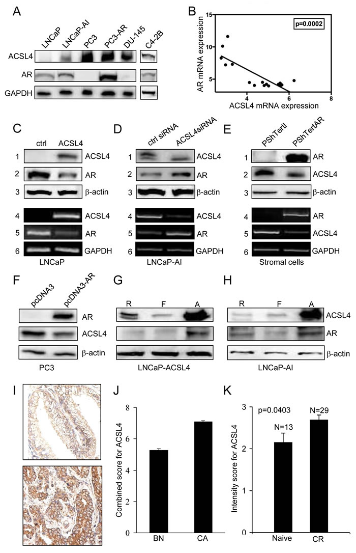 Figure 1: Expression of ACSL4 in PCa cell lines. Western blot analysis of whole cell lysates showed expression of ACSL4 and AR with GAPDH as loading control A. Values shown are derived from mRNA expression data reported by Wang et al. [43]. B. ACSL4 and AR level in LNCaP ACSL4 overexpression cells and vector control cells by western blot analysis (1-3) with β-actin as loading control and RT-PCR analysis (4-6) with GAPDH as loading control C. ACSL4 and AR level in LNCaP-AI cells treated with ACSL4 siRNA and control siRNA by western blot analysis (1-3) with β-actin as loading control and RT-PCR analysis (4-6) with GAPDH as loading control D. ACSL4 and AR level in PShTertAR prostate stromal cells and PShTert prostate stromal cells by western blot analysis (1-3) with β-actin as loading control and RT-PCR analysis (4-6) with GAPDH as loading control E. ACSL4 and AR level in PC3 AR overexpression cells and PC3 cells by western blot analysis with β-actin as loading control F. ACSL4 and AR level in LNCaP ACSL4 overexpression cells in regular, hormone-free and androgen media by western blot analysis with β-actin as loading control G. ACSL4 and AR level in LNCaP-AI cells in regular, hormone-free and androgen media by western blot analysis with β-actin as loading control H. The expression of cytoplasmic ACSL4 in benign and malignant prostatic tissues by immunohistochemical staining I. The mean expression Allred score of cytoplasmic ACSL4 in benign and malignant prostatic tissues J. The intensity scores of expression of ACSL4 in hormone-naive PCa and hormone-resistant PCa K.