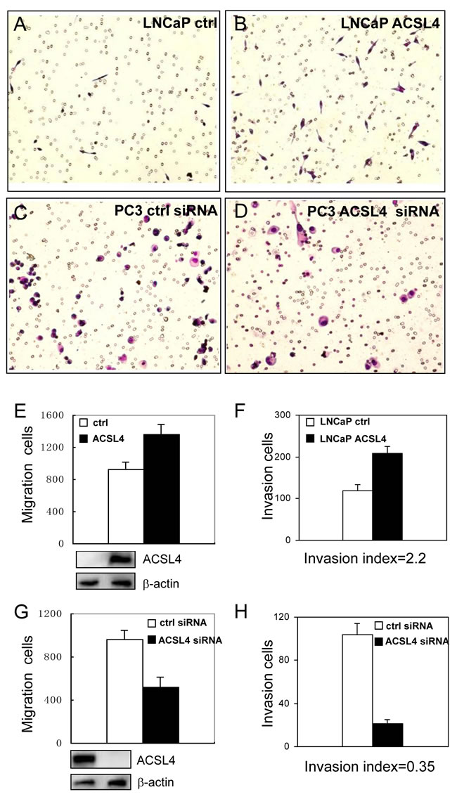 Figure 3: Effect of ACSL4 expression on invasion capability of PCa cells. The migration and invasion ability were measured on LNCaP-ctrl and LNCaP-ACSL4 cells by Matrigel assay A.-B. Bar graph indicates the average number of cells per field, and Western blot analysis of ACSL4 expression in control and ACSL4-transfected LNCaP cells E.-F. PC3 cells were treated with ACSL4 siRNA or control siRNA C.-D. Bar graph indicates the average number of cells per field that traversed the membrane and Western blot analysis of ACSL4 expression in control and siRNA-treated cells G.-H.