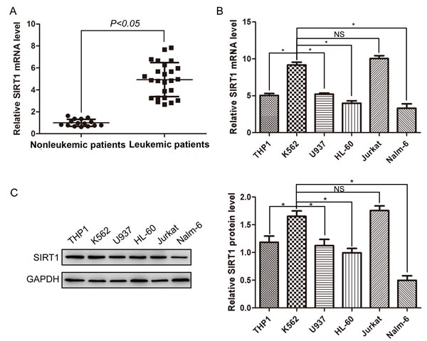 Figure 1: Expression of SIRT1 in MNCs from leukemic patients and leukemia cell lines. A. Relative expression of SIRT1 in MNCs from 15 non-leukemic and 25 leukemic patients. Relative SIRT1 mRNA levels normalized to β-actin were analyzed by Real-time PCR. B. Relative expression of SIRT1 in six leukemia cell lines. Relative SIRT1 mRNA levels normalized to β-actin were analyzed by Real-time PCR. C. Protein expression of SIRT1 in six leukemia cell lines with β-actin as an internal control. *P < 0.05, NS indicated no significance.