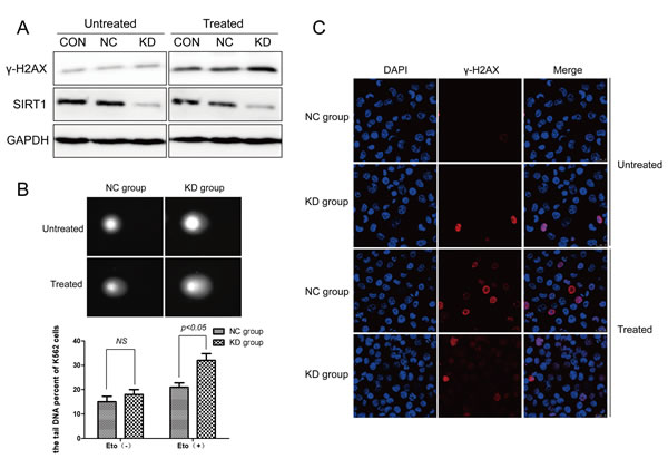 Figure 2: DNA damage was enhanced following SIRT1 knockdown in response to etoposide treatment. A. K562 cells were infected with lentivirus carrying SIRT1 or control shRNA, and treated with or without etoposide. Total proteins were extracted for Western blotting of SIRT1, γ-H2AX and GAPDH. SIRT1 proteins decreased by 85.14% (P < 0.05) with SIRT1 shRNA compared with the CON group. No significant difference in SIRT1 protein expressions were observed between the CON and NC groups. B. Alkaline comet assay was performed to assess DNA damage after 20 μM of etoposide treatment for four hours in NC and SIRT1 knockdown (KD) cells. C. Representative immunofluorescence staining for γ-H2AX (red) and DNA (blue) in NC and SIRT1 knockdown (KD) cells with or without 20 μM of etoposide treatment for four hours.