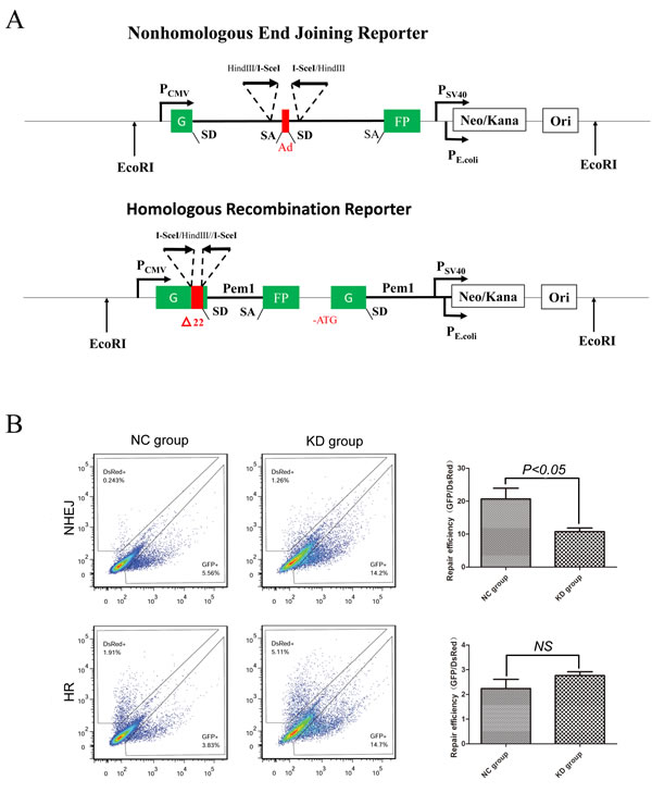Plasmids containing NHEJ, HR reporter cassettes and pDsRed-N1 as the internal controls were kindly provided by Dr Zhiyong Mao from the School of Life Science and Technology of Tongji University(Shanghai, China).Plasmids containing NHEJ or HR reporter cassettes were linearized by I-SceI restriction enzymes and purified using Qiagen Qiaex II purification kit (20021; Qiagen, Valencia, CA). Cells were transfected with 0.5 μg of NHEJ reporter construct or 2 μg of HR reporter construct, and 0.1 μg of pDsRed-N1 as internal control. Transfections were performed using an Amaxa Nucleofector (Walkersville, MD). Cells were analyzed by flow cytometry three days after transfection [32].