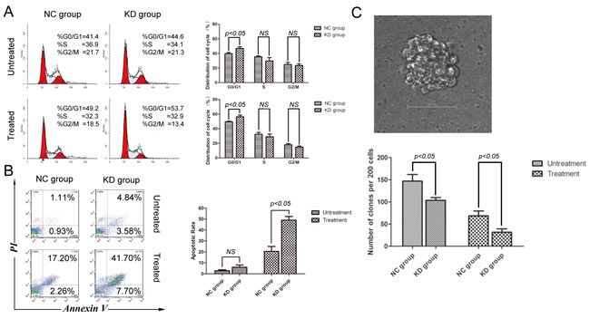 Figure 4: SIRT1 knockdown induced cell cycle arrest and apoptosis, while reducing the clonogenic capacity of K562 cells. A. Effects of SIRT1 knockdown on cell cycle distribution of K562 cells. Representative flow histograms depicting cell cycle distribution of K562 cells with or without 20 μM of etoposide treatment for four hours are shown. B. Effects of SIRT1 knockdown on K562 cell apoptosis. Three days after infection of lentivirus containing negative control shRNA (NC) or shSIRT1, 20μM of etoposide was added for four hours; and apoptosis was analyzed 48 hours later by flow cytometry. C. Effects of SIRT1 knockdown on K562 cell colony formation. Two hundred NC and SIRT1-KD cells per plate with or without 20μM of etoposide treatment for four hours were seeded in standard 2-layer soft agar in triplicate. Colonies were scored after seven days. SIRT1 knockdown significantly inhibited soft agar colony formation of K562 cells. Error bars represent SD from three experiments.