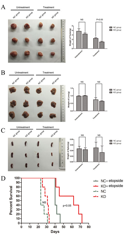 To extend our observations in vivo, we transplanted ShSIRT1-KD and shRNA-NC K562 cells with or without etoposide treatment via subcutaneous injection into sublethally irradiated (250 cGy) NOD/SCID mice, and evaluated l tumorigenesis by detecting tumor weights and mice survival. As shown in Figure 5A, four weeks after transplantation, although there is no significant difference in tumor weights between the shSIRT1-KD group and shRNA-NC group without etopside treatment, the shSIRT1-KD group showed marked retardation in tumor growth (1.48±0.19g), compared with shRNA-NC group(2.26±0.16g, p < 0.05) after etoposide treatment. However, four weeks after engraftment, the weights of livers and spleens in the shSIRT1-KD group were similar to the control group (Figure 5B and 5C). In addition, the group engrafted with shSIRT1-KD K562 cells had a longer life-span than the shRNA-NC group after etopside treatment (Figure 5D). These results revealed that SIRT1 inhibition effectively reduced the tumorigenesis ability of K562 cells in vivo.