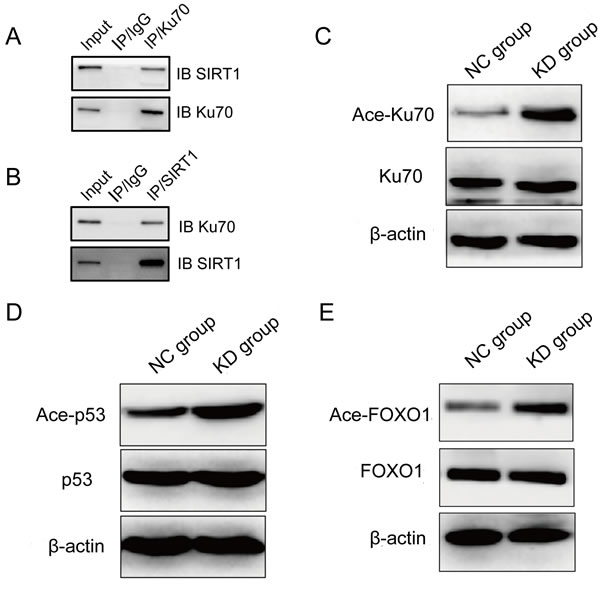 Cells were harvested and lysed in lysis buffer for protein extraction followed by the determination of protein concentration, and the supernatant was used for Western blotting. Proteins were separated by SDS-PAGE and transferred onto polyvinylidene fluoride (PVDF) membranes. The membranes were incubated with primary antibodies (Rabbit polyclonal anti-human SIRT1 [Epitomics], 1:1000; rabbit anti-human Ku70 [Epitomics], 1:1000; rabbit polyclonal anti-acetylated p53 [Cell Signaling Technology], 1:1000; rabbit polyclonal anti-acetylated FOXO1 [Santa Cruz Biotechnology], 1:1000; β-actin [Cell Signaling Technology], 1:1000) followed by incubation with secondary antibodies conjugated to horseradish peroxidase (HRP-donkey-anti-rabbit). Signal development was performed with an ECL kit. The experiment was performed three times. To analyze Ku70 acetylation, Ku70 was pulled down from total cell lysate with conjugated anti-Ku70-agarose beads (Santa Cruz Biotechnology), followed by acetylation detection with rabbit anti-acetyl lysine antibody (Cell Signaling Technology). Moreover, in order to analyze the direct interaction between SIRT1 and Ku70, SIRT1 or Ku70 was pulled down from total cell lysate with conjugated anti-SIRT1 or Ku70-agarose beads (Santa Cruz Biotechnology), followed by Ku70 or SIRT1 detection with rabbit anti-Ku70 or SIRT1 antibody (Cell Signaling Technology).