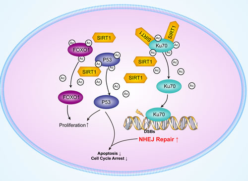 Figure 7: Schematic model of the upregulation of Ku70, p53 and FOXO1 deacetylation by SIRT1.