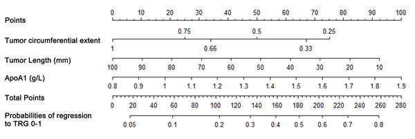 Nomograms that incorporated the selected predictive factors were established (Figures 1 and 2). The nomogram demonstrated that tumor length and ApoA1 shared the largest contribution to good regression, followed by tumor circumferential extent. In predicting good down-staging, tumor circumferential extent showed the greatest contribution, followed by tumor length, Age, and ApoA1. Each of these variables was assigned a score on the point scale. Through adding up of the score of each variable and referring to the total point scale, we could draw a straight line to determine the estimated probability of TRG 0-1 and ypT0-2N0.