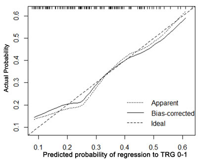 Figure 3: Calibration plot of the predicted and observed probabilities of regression to TRG 0-1. The prediction calculated using the nomograms were plotted on the X-axis, and the observed rate of regression and down-staging is plotted on the Y-axis.
