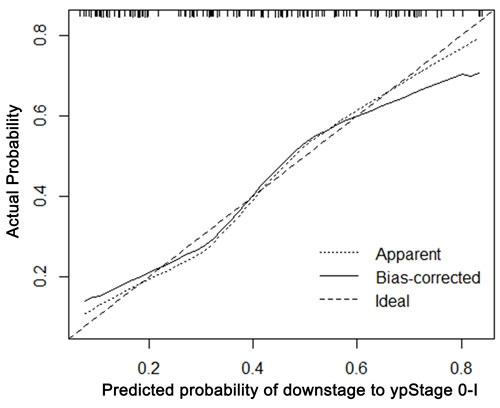 The calibration plots presented good statistical performance upon internal validation between the nomogram prediction and actual observation for probability of TRG 0-1 (Figure 3) and good down-staging (Figure 4). The Harrell’s concordance index (C-index) for the established nomogram to predict tumor regression to TRG 0-1 was 0.72 (95% CI: 0.604-0.797) and 0.762 (95% CI: 0.681-0.844) for good down-staging.