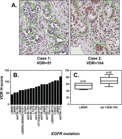 Figure 1: VDR is expressed in EGFR mutant tumors. A tissue microarray (TMA) was constructed from 84 lung tumors resected from lifetime never-smokers diagnosed with lung cancer. The TMA was stained for VDR, and nuclear expression was quantified by a reviewer blinded to sample identity. A. Images of cores in which VDR was detected at relatively low and relatively high levels, respectively. Tumor cells that were scored for VDR are circled in green. B. VDR H-scores were calculated for lung tumors that harbor at least one EGFR mutation. C. The VDR H-scores for cases harboring EGFR exon 19 deletions or L858R mutations are displayed. Data are presented only for those cases in which 3 cores were analyzed, and > 100 nuclei per core were scored. The lower, middle, and upper lines of each box represent the lower quartile, median and upper quartile of H-scores.