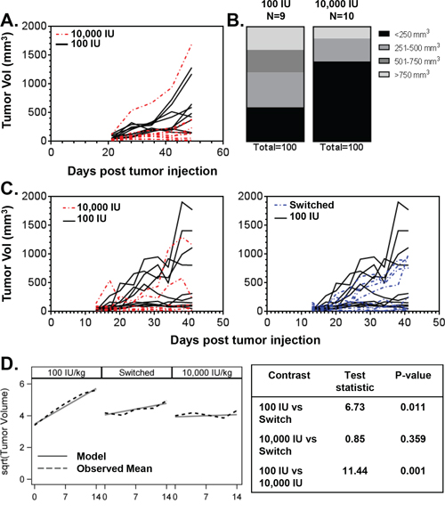 Thus far, we have demonstrated that 25D3 is capable of inhibiting the in vitro growth of EGFR mutant NSCLC cells and inducing VDR target gene expression. Next, we investigated if elevating serum 25D3 concentrations in vivo would affect the growth of EGFR mutant NSCLC xenografts. To do so, nude mice were placed on research diets containing either 100 international units vitamin D3/kilogram diet (IU VD3/kg) or 10,000 IU VD3/kg diet (n = 10 mice per group). Once ingested, VD3 is rapidly converted into 25D3, thereby allowing for a simple method of elevating serum 25D3 concentrations. After seven weeks, when stable 25D3 blood levels were achieved, HCC827 cells were subcutaneously injected into the flank of each mouse. Tumors were first measurable at day 21 post-implantation. At study termination, plasma 25D3 concentrations were 12 ng/mL for mice on the 100 IU VD3/kg diet and 68.5 ng/mL for mice on the 10,000 IU VD3/kg diet. 1,25D3 levels were less variable and averaged 56.3 pg/mL in the 100 IU VD3/kg diet group and 51.4 pg/mL in the 10,000 IU/kg group. The decline in 1,25D3 levels in the 10,000 IU VD3/kg diet group most likely result from suppression of renal CYP27B1 expression [30]. No toxicity was observed from the VD3-containing diets, as evidenced by normal serum calcium concentrations and steady increase in mouse weights (data not shown). Mice receiving the 10,000 IU VD3/kg diet displayed markedly different tumor outgrowth than mice fed the 100 IU VD3/kg diet (Figure 4A). The tumor volumes of mice receiving the 10,000 IU VD3/kg diet at days 21 (p = 0.017), 28 (p = 0.043), 35 (p = 0.004), and 42 (p = 0.010) post-tumor injection were significantly lower than that of mice on the 100 IU VD3/kg diet. At study termination, 70% of mice that received high dietary VD3 and 30% of mice that received low dietary VD3 had tumor volumes < 250 mm3 (Figure 4B).