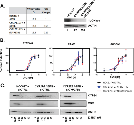Figure 6: 25D3 induces target gene transcription despite marked reduction in CYP27B1 expression. A. CYP27B1 mRNA (left panel) and 1αOHase (right panel) expression was compared 24 h post-transfection of siCTRL into HCC827 and CYP27B1-ZFN cells or CYP27B1 siRNA into CYP27B1-ZFN cells. For mRNA expression data, average corrected Ct values were calculated by subtracting the GAPDH Ct from the CYP27B1 Ct value. Fold-change was calculated using the 2-ΔΔCt method. B. VDR target gene expression was studied in cells transfected with siRNA for 24 h and then treated with the indicated concentrations of 25D3 for 6 h. qRT-PCR was performed to quantify gene induction. Dose response curves were created in GraphPad Prism. Error bars represent standard error of the mean for triplicate samples within a single experiment. C. Induction of VDR and CYP24 protein was examined by Western blot (15 μg total protein per lane). Cells were transfected with siRNA for 24 h and then treated with 25D3 for 6 h. CYP27B1-ZFN+ siCYP27B1 samples were run concurrent with siCTRL-transfected cells but were on a separate gel. All gels were exposed for the same amount of time.