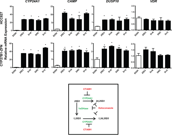 Figure 7: 25D3 is active in HCC827 cells in the absence of detectable 1αOHase activity. Cells were treated in triplicate with EtOH vehicle control, 1 μM 25D3(D), 1 μM 25D3 + 10 μM Ketoconazole (D+K), 1 μM 25D3 + 50 nM CTA091 (D+C) or 1 μM 25D3 + 10 μM Ketoconazole + 50 nM CTA091 (DKC) for 3 h. RNA was isolated and gene expression quantified by qRT-PCR. The 3 h timepoint was chosen because 1αOHase was 90% inhibited in HCC827 cells and fully inhibited (below the lower limit of quantitation) in CYP27B1-ZFN cells. Error bars represent standard error of the mean, and asterisks represent p < 0.05 by Student’s t-test for vehicle versus treated cells.