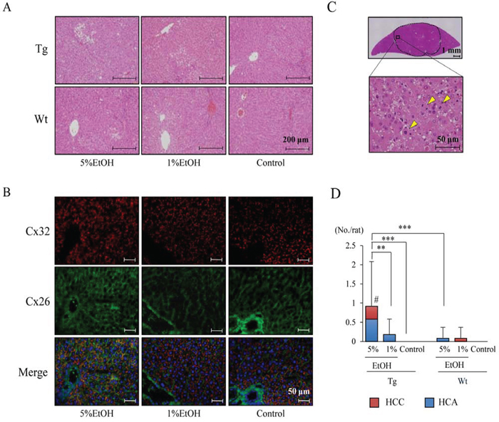 Figure 1. EtOH intake after DEN injection enhances hepatocarcinogenesis in Tg rats. A. H&E staining of non-tumor region of the liver in each group. B. Immunofluorescence staining for Cx32 (red) and Cx26 (green) in livers of Wt rats. C. H&E staining of HCC in Tg rats given 5% EtOH. Mitotic cells are indicated by arrowheads. D. Multiplicity of HCC, HCA and total tumors. Data are presented as mean ± SD, n = 11–12 per group. **, *** P < 0.01 and 0.001, respectively. # P < 0.05 indicates statistical significance in HCC as compared to Tg-Control and Wt-5%EtOH.