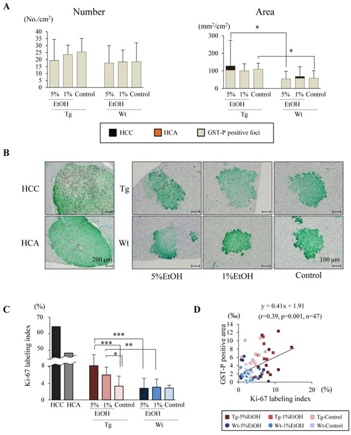 Figure 2. EtOH intake promotes cell proliferation in GST-P positive foci of Tg rats. A. Number and area of GST-P positive lesions including foci, HCA and HCC. B. Double immunohistochemical staining for Ki-67 (brown) and GST-P (green). C. Ki-67 labeling indices in HCC, HCA and GST-P positive foci of each group. D. Calculation of the regression line based on the relationship between Ki-67 labeling index and GST-P positive area by Pearson’s correlation (r = 0.39, p = 0.001, n = 47). Data are presented as mean ± SD, n = 11–12 per group. *, **, ***: P < 0.05, 0.01, and 0.001 respectively.