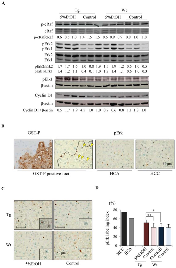 Figure 3. EtOH intake activates Erk signaling pathway in Tg rats. A. Western blotting analysis for components of the Erk pathway including p-c-Raf (Ser338), c-Raf, Erk1/2, pErk1/2 (Thr202/Tyr204), pElk1 (Ser383), and cyclin D1. B. GST-P and pErk in liver of Tg rat given EtOH. Nucleolar pErk is indicated by arrowheads. C. Immunohistochemical staining for pErk in GST-P positive foci of each group. D. The percentage of nucleolar pErk positive hepatocytes in HCC, HCA of Tg-5%EtOH group and GST-P positive foci of each group. Date are presented as mean ± SD, n = 11–12 per group. *,**: P < 0.05 and 0.01 respectively.