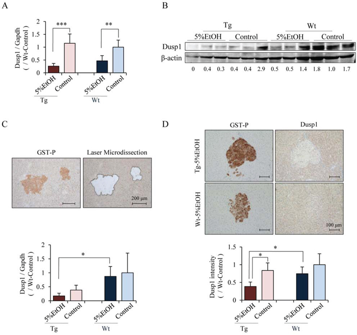 Figure 4. The mRNA and protein levels of Dusp1 were decreased by EtOH in Tg rats especially in GST-P positive foci. Levels of Dusp1 mRNA A. and protein B. in whole liver tissues measured by quantitative RT-PCR and western blotting, respectively. Data of quantitative RT-PCR are presented as mean ± SD, n = 4 per groups. **, ***: P < 0.01 and 0.001 respectively. Representative image of laser microdissected tissue (upper) and Dusp1 mRNA level in GST-P positive foci as determined by quantitative RT-PCR (lower) C. Immunohistochemical staining for Dusp1 in GST-P positive foci of Tg and Wt rats that received 5%EtOH (upper) and the intensity score of Dusp1 in GST-P positive foci as compared to Wt-control rats (lower) D. Data are presented as mean ± SD, n = 5 per group, 10 foci/rat. *: P < 0.05.