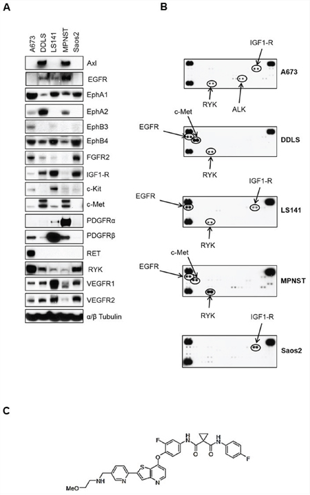 Figure 1: Basal levels of total and phosphorylated receptor tyrosine kinases in five sarcoma cell lines. A. Approximately, 1 × 106 cells were plated in 60 mm plates in media containing 10%FBS and grown for 24 hours. Next day, 30 micrograms of RIPA lysates were loaded on SDS/PAGE and immunoblotted using indicated antibodies. B. 1 × 106 cells were plated in 60 mm plates for 24 hours in media containing 10%FBS. Next day, lysates were prepared according to manufacturer’s instructions (R&D Systems, ARY001B) and 200 micrograms of lysates were applied to phospho-RTK membranes overnight at 4°C. Arrows indicate phosphorylated RTK spots in duplicate. C. MGCD516 (Sitravatinib) is a novel, potent multi-kinase small molecule inhibitor. Chemical structure of MGCD516 is shown.