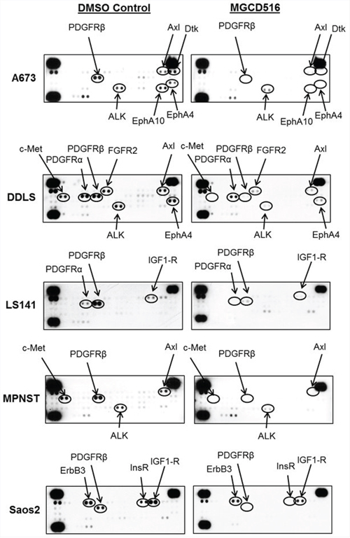 Figure 3: Broad spectrum activity of MGCD516 shows blockade of multiple RTKs across various sarcoma subtypes. Approximately, 1 × 106 cells were plated in 60mm plates in serum free media for 24 hours. Next day, DMSO or MGCD516 was added in serum free media and treated for 3 hours. Cells were then stimulated in media containing 10% FBS for 1 hour. Following stimulation, lysates were prepared according to manufacturer’s instructions (R&D Systems, ARY001B) and 200 micrograms of lysates were applied to phospho-RTK membranes overnight. Arrows indicate phosphorylated RTK spots in duplicate.