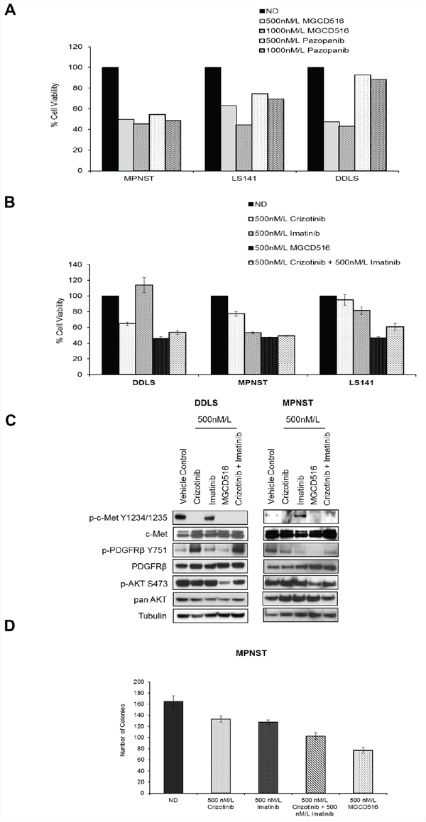 Western blot analysis comparing MGCD516 against imatinib and crizotinib either alone or in combination, in the two sensitive cell lines DDLS and MPNST, showed that MGCD516 was efficient in blocking multiple RTKs and showed significantly better inhibition of downstream effectors such as p-AKT (Ser473) than the other two drugs (Figure 4C). We also compared the efficacy of MGCD516 against imatinib and crizotinib using a colony formation assay as a measure of tumorigenicity. In MPNST cell line, treatment with MGCD516 at 500 nmol/L, concentration similar to the one used for cell proliferation assay comparisons, resulted in significant reduction in colony number compared to no drug control as well as compared to imatinib and crizotinib treatment alone (p<0.05, Figure 4D). Similar to the results obtained in Figure 4B, effect of imatinib and crizotinib combination treatment was comparable to MGCD516 alone (Figure 4D). Furthermore, comparison against two structurally similar drugs, carbozantinib [30] and foretinib [31], showed that MGCD516 had a significantly higher anti-proliferative effect (p < 0.05, Supplementary Figure S2A).