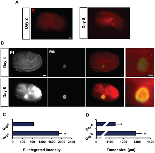 Figure 2: Visualization of tumor growth and cell death in the VOGIM protocol. A. Representative fluorescence images for PI staining of brain slices to detect cell death after 8 days in culture. Scale bar represents 500 μm. B. Representative fluorescence images monitoring tumor growth (green) and cell death (PI) at day 4 and day 8. Scale bar represents 500 μm. C. Quantification of cell death (PI intensity quantification) at day 4 and 8 (n = 9). D. Quantification of tumor size measurements on day 4 and 8 (n = 9). Scale bar represents 500 μm. Statistical analysis was performed with Student's t-test (*P < 0.05, mean is given ± s.e.m.).