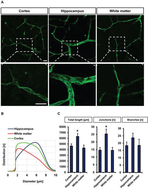 Figure 3: Visualization and quantification of the vasculature in different brain slice areas. A. Cortex, hippocampus and white matter were candidate to monitor vascularization in different bran slice areas. Laminin antibody was utilized to stain vessels. Scale bar represents 20 μm. B. Distribution of vessels diameter (μm) in cortex, hippocampus and white matter (n = 6). C. Quantification of different vascular parameters total vessels length, number of junctions and branches with Image J Angiogenesis tools plugin. Images with 314 μm x 314 μm size were used for quantification. Statistical analysis was performed with Student's t-test (*P < 0.05, error bars represent mean ± s.e.m.).