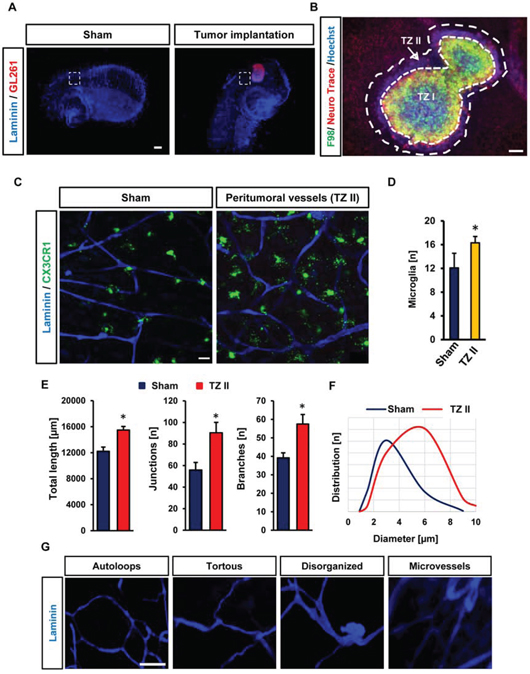 Hence, we investigated the tumor microenvironment in glioma-infiltrated brain tissue. For this we implanted red fluorescent protein-expressing tumor cells in brain slices from CX3CR1-GFP mice (Figure 4A). CX3CR1-GFP mice express GFP under the macrophage/microglia-specific promoter CX3CR1 thus enabling time lapse microglia movement tracking in vivo as well as visualization of perivascular microglia and their relation to newly formed vessels. After fixing and immunostaining in free-floating, VOGIMs were mounted onto microscopic slides. Brain tumors form a specific tumor microenvironment which consists of different heterogeneous areas with at least three different tumor zones termed TZ I-III [26]. Within this concept TZ I represents the tumor bulk whereas TZ II displays the peritumoral or perifocal area characterized by microglial activation and neuronal cell damage surrounding the tumor bulk. TZ III is revealed as the area following the perifocal area containing only few single tumor cells regarded as cancer stem cells or cancer initiating cells (Figure 4B, Supplementry Figure 2). Therefore, we examined blood vessels in the peritumoral area (TZ II) in comparison to similar areas which were sham treated (i.e. implanted with same volume of cell free medium) (Figure 4A). Interestingly, when we analyzed the neuronal distribution we found a clear pattern of tumor zones with a rim of cell damage surrounding the tumor bulk (Figure 4B, Supplementry Figure 2).