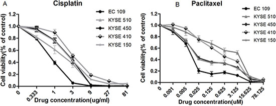 Figure 1: Response of panel of 5 cell lines to cis-platinum and paclitaxel-induced growth inhibition. Cells were treated with gradient dilution of drugs for 48 h, the apoptosis was detected using CCK8 assay. (A) EC109 cell line was most sensitive to cis-platinum, with IC50 = 0.98 μg/ml, and KYSE 410 was relatively resistant, with IC50 = 3.68 μg/ml; (B) EC109 cell line was most sensitive to paclitaxel, with IC50 = 0.0083 uM, and two cell lines of KYSE410 and KYSE510 were relatively resistant, with IC50 = 3.21 uM.