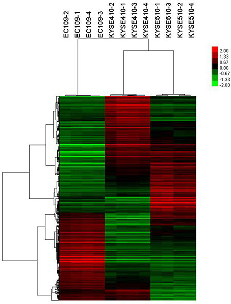 For Affymetrix microarray profiling, total RNA was isolated with Trizol reagent (Invitrogen, Canada) and purified using RNeasy Mini Kit (Qiagen, German), including a DNase digestion treatment. RNA concentrations were determined by the absorbance at 260 nm and quality control standards were A260/A280 = 1.8–2.1, using NanoDrop 2000 (Thermo, America). cDNA of cell lines KYSE510, KYSE410, and EC109 was hybridized to GeneChip Human Transcriptome Array 2.0 (Affymetrix, America) according to the User Manuals.Affymetrix® Expression Console Software (version 1.2.1) was used for microarray analysis. Raw data (CEL files) were normalized at transcript level using robust multiaverage method (RMA workflow). Median summarization of transcript expressions was calculated. Gene-level data was then filtered to include only those probe sets that are in the ‘core’ metaprobe list, which represent RefSeq genes.