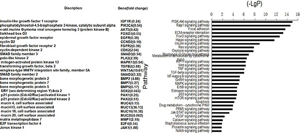 Figure 3: Pathway analysis showed that the differentially expressed genes were involved in the signaling pathways important to cell proliferation, apoptosis, cell adhension and so on (right). The left of figure presented the identified genes and the fold changes in the sensitive cell line vs. resistant cell lines. < 1 indicates downregulation, and > 1 indicates upregulation.