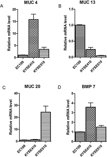 Figure 4: Validation of microarray data analysis. The expression of these 6 genes (MUC4, MUC13, MUC20, BMP7, SMAD3, and Akt3) in the panel cell lines (EC109, KYSE410, KYSE510) was measured by qRT-PCR using the 2-ΔΔCt method. The 4 genes shown in the graph were found to be significantly differentiated expressed between sensitive cell line (EC109) and resistant cell lines (KYSE410 and KYSE510) and the results are consistent with the microarray data analysis. Data are expressed as the mean and SD, with relative fold expression on the y-axis.