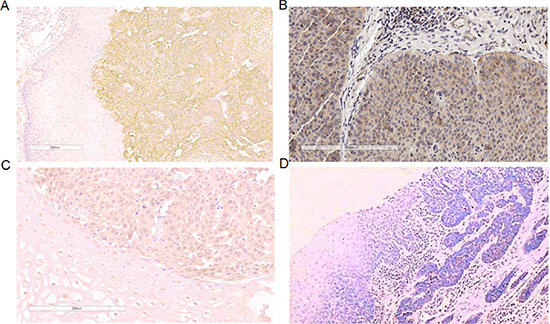 Figure 5: Expression of MUC4/MUC13/MUC20 protein in ESCC. (A) high expression of MUC4 in ESCC (×200); (B) high expression of MUC13 in ESCC (×200); (C) high expression of MUC20 in ESCC (×200) (D) negative control (×200), with primary antibody replaced by PBS.