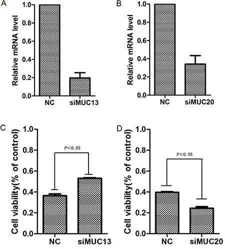 Figure 6: Kncokdown of MUC13 or MUC20 affected the sensitivity of ESCC cells to chemotherapy agent. Cells were transfected with either siRNA targeting MUC13, MUC20 gene or scrambled sIRNA for 48 h, then the expression of MUC13 and MUC20 were measured by using Real-time PCR. (A) Knockdown of MUC13 in ESCC cell line EC109(sensitive cell line); (B) Knockdown of MUC20 in ESCC cell line KYSE510 (resistant cell line). After transient transfection, the cells were treated with IC50 concentration of paclitaxel (0.0083 uM for EC109 and 3.21 uM for KYSE510) in 100 μl medium for 48 h and then the cell viability was measured by using CCK8 assay. (C) blockage of MUC13 in EC109 inhibited paclitaxel-induced apoptosis and promoted cell survival. (D) blockage of MUC20 in KYSE510 increased paclitaxel-induced apoptosis and the cell viability decreased.