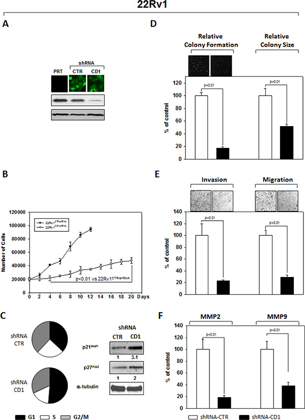 Figure 2: Stable and Specific Silencing of cyclin D1 inhibits 22Rv1 onco-phenotype. (A) Parental 22Rv1 (PRT), GFP-positive 22Rv1 cells, stably infected with shRNA-cyclin D1 (CD1) vs. shRNA-control (CTR) sequence (CTR), were selected by FACS sorting and examined for cyclin D1 protein expression by immunoblotting. (B) Cell growth assay, (C) cell cycle distribution by FACS and p21waf1, p27KIP2 by immunoblotting, (D) soft agar assay and relative colony size, (E) invasion- and migration-assay and (F) the activation status of MMP-2 and MMP-9 by ELISA assay were performed. The data presented in Figure 1B, 1C, 1D, 1E and 1F represent the mean ± SD of 3 independent experiments. Statistical analysis was performed using the Student’s t-test, P < 0.01. For immunoblotting, α-tubulin expression shows equal loading. Similar results were obtained in n = 3 experiments.