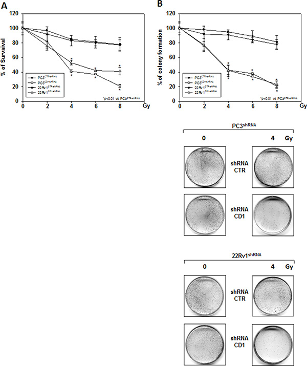 Figure 3: Silencing cyclin D1 radiosensitizes PC3 and 22Rv1 cell lines in vitro. shRNA-cyclin D1- (CD1) and shRNA-control-transduced (CTR) PC3 and 22Rv1 cells were irradiated with various doses (0–8 Gy): (A) MTT and (B) (Upper Panel) colony formation assays were performed. The data presented in Figure 3A and 3B Upper Panel represent the mean ± SD of 3 independent experiments. Statistical analysis was performed using the Student’s t-test, P < 0.01. Figure 3B Lower Panel shows the effects of 4 Gy irradiation on shRNA-cyclin D1- and shRNA-control-transduced PC3 and 22Rv1 cells.