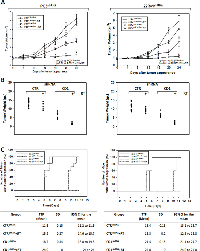 Figure 4: Silencing cyclin D1 radiosensitizersPC3 and 22Rv1 cell lines in vivo. Mice xenografted with shRNA-cyclin D1- (CD1) and shRNA-control-transduced (CTR) PC3 (Left Panel) or 22Rv1 (Right Panel) cells subjected to radiation treatment (5 fractions of 2 Gy were delivered over 5 consecutive days for a total dose of 10 Gy) starting when the tumor volume reached 0.5–1.0 mm3 (T0). (A) Tumor volume, (B) tumor weights and (C) number of mice with tumor progression.