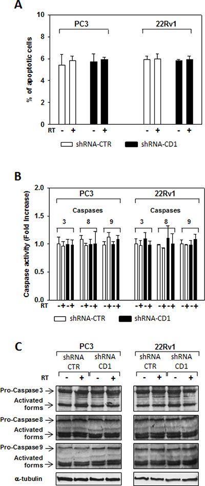 Data not shown. Cyclin D1 silencing did not radiosensitize by inducing apoptosis. control- (CTR) and cyclin D1-shRNA (CD1) transduced PC3 and 22Rv1 cells were subjected to 4 Gy of irradiation. (A) TUNEL assay and the evaluation of caspase-3, -8 and -9 activation by ELISA (B) and western blott (C) assays were performed after 6 hours from irradiation. The data presented in A and B represent the mean ± SD of 3 independent experiments. Statistical analysis was performed using the Student’s t-test, P < 0.01.