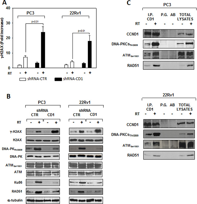 Figure 6: cyclin D1 depletion do not radiosentize via inducing apopotosis but rather by impairing the molecular machinery responsible of the DNA double-strand break repair. shRNA-cyclin D1- (CD1) and shRNA-control-transduced (CTR) PC3 or 22Rv1 cells irradiated with a single dose of 4 Gy. (A) 6 hours post RT, H2AX activation status was investigated using and ELISA assay for γ-H2AX; the data represent the mean ± SD of 3 independent experiments. Statistical analysis was performed using the Student’s t-test, P < 0.01. (B) Cell lysate were processed for the indicated proteins by immunoblotting; α-tubulin demonstrates equal loading. Similar results were obtained in n = 3 experiments. (C) Cyclin D1-DNA-PKCs, -ATM, -RAD51 heterodimers in PC3 (Upper Panel) or 22Rv1 (Lower Panel) cells untreated (−) or treated (+) with RT (4 Gy). 6 hours post RT, cyclin D1 was immunoprecipitated (IP) with an anti-cyclin D1 polyclonal antibody from extracts containing equal amounts of total proteins and subsequently analyzed by immunoblotting with a cyclin D1, DNA-PKCsThr2809, ATMSer1981 or RAD51 monoclonal antibodies. Similar results were obtained in n = 2 experiments.