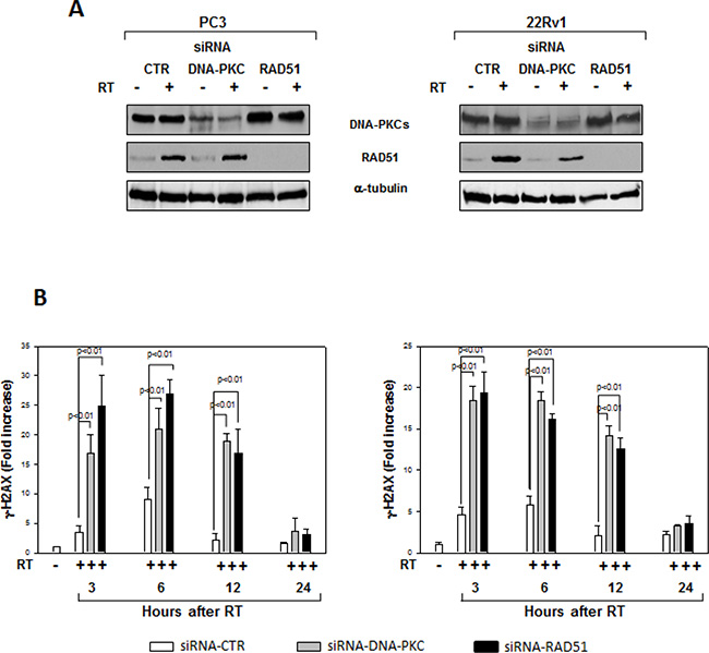 Figure 8: Effects of RAD51 or DNA-PKcs siRNA on DNA damage. (A) Reduced RAD51 or DNA-PKcs expression by RAD51 or DNA/PKcs siRNA. Western blot analysis performed using lysates isolated from PC3 (Left Panel) or 22Rv1 (Right Panel) cells expressing RAD51, DNA-PKcs or Control siRNA and subjected to 4 Gy of RT. Cell lysates were processed for the indicated proteins by immunoblotting; α-tubulin expression shows equal loading. (B) H2AX activation status was investigated by using an ELISA assay for γ-H2AX at different time from RT treatment; the data represent the mean ± SD of 3 independent experiments. Statistical analysis was performed using the Student’s t-test, P < 0.01. Similar results were obtained in n = 3 experiments.