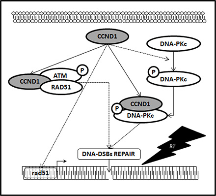 RT works through damaging the DNA of exposed tumor tissue leading to cell death: DNA double-strand breaks (DSBs), the most deleterious lesions, are repaired by two main pathways namely non-homologous end joining (NHEJ) and homologous recombination (HR). Activation of DSBs repair genes is one of the reasons for chemo- and radioresistance, therefore, targeting DSBs repair is an attractive strategy to eliminate cancer [6–9]. The relationship between cyclin D1 and DSBs repair machinery is largely unknown and the fact that cyclin D1 has the hallmarks of a cellular proto-oncogene suggests its possible key role in promoting DNA repair and consequently promote radioresistance of PCa cells. Previous studies reported a correlation between cyclin D1 overexpression, perturbation of the DNA repair machinery and acquisition of a radioresistant phenotype in cancer cells [17–22]. No evidences has yet collected on the relationship between cyclin D1 and radiosensitivity of androgen-independent PCa cells radioresistance. Herein, silencing cyclin D1 radiosensitizedandrogen-independent PCa cell lines both in vitro, reducing cells clonogenic survival, and in vivo impairing xenograft growth of the PCa cells after RT treatment. Cancer cells escape from RT by repairing the DNA lesions trough the activation of highly conserved enzymatic pathways: only the accumulation off rank unrepaired breaks may generate chromosomal aberrations that, after a variable number of cell cycles, induce cell death. This mode of cell death is considered the major mechanism by which solid tumors respond to clinical radiotherapy. Apoptosis is an alternative mode of cell death after RT, but appears to be preferentially expressed in embryonal and haematopoietic cells, with significantly lower levels of induction in epithelial cell types as well as in solid human cancers with an epithelial origin [47]. Our data shows that the radiosensitization induced by silencing cyclin D1 does not depend on apoptosis but rather by an increased accumulation of DNA-DSBs damage; RT treatment did not modify the percentage of apoptotic cells regardless of the expression of CCDN1, while it drastically increased DNA-DSBs damage, as suggested by the accumulation of activated H2AX protein [48]. Our data indicate that in PCa, such as in other cancers of epithelial origin, RT induces cell death by promoting DNA-DSBs phenomena; in this scenario cyclin D1 seems to be the guardian against RT-induced DNA damages. HR, through the ATM-RAD51-and NHEJ, via the DNA-PKcs-pathway, are the main highly conserved enzymatic pathways involved in repair of RT-induced DNA-DSBs [6–10]. We finally investigated the molecular partners of cyclin D1 responsible of cyclin D1-mediated radioresistance in PCa. A proteomic screen for cyclin D1 protein partners, performed in several types of human tumors, shows that cyclin D1 interacts with proteins implicated in DNA repair machinery such as RAD51 [17–22]. Herein, in vitro and in vivo, we show that cyclin D1 silencing abrogated the DNA-PKcs phosphorylation/activation (NHEJ pathway) and RAD51 accumulation (HR pathway) induced by RT. Although no modifications of ATM phosphorylation/activation status were showed, we found that cyclin D1physically interacts with posphorylated-activated-ATM as well as with activated-DNA-PKcs and RAD51: their associatedis increased in an RT dependent manner. Thus, cyclin D1 seems to play a dual role in controlling DNA-DSBs repair pathways; firstly by regulating NHEJ and HR pathways by sustaining the activation of DNA-PKcs, ATM and the expression basal levels of RAD51 and secondly by directly interacting with the DNA-DSBs repair machinery. The key role cyclin D1 in regulating androgen independent PCa cells radioresistance was also demonstrated by the observation that silencing of DNA-PKcs or RAD51 drastically increases the radiosensitivity of PCa cells. Thus, our evidence strongly suggests that cyclin D1 regulates the activity of downstream DDR machinery and promotes radioresistance of androgen independent PCa cells. The schematic showen in Figure 9 outlines the mechanism identified in our findings. Many issues should be further investigated such as the mechanisms by which cyclin D1 regulates the RT-induced ATM and DNA-PKCs-phosphorilation/activation, the mechanism by which cyclin D1 influences the RAD51 RT-induced DDR and the significance of the physical interaction between cyclin D1 and other members of DNA-DSBs repair machinery. Furthermore, cancer stem cell radioresistance has been described in several cancer types including prostate cancer [49–50] and it will be of interest to test whether silencing cyclin D1 in PCa cells that express stem-like properties improves radiosensitivity.