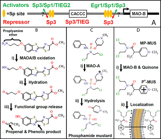 Figure 1: The MAOB gene promoter region and potential MAOB catalyzed prodrug maturation reactions. (A) The regulation sites of the MAOB gene promoter are shown in cartoon form. There are three main reactions that can use MAOA or MAOB for the conversion of pro-drugs/dyes into their mature, active, form, in the intramembrane space of mitochondria: (B) Propylamine ethers undergo oxidation by MAO into the corresponding imine, which then undergo hydration and conversion into the unstable aldehyde. Electron redistribution cleaves the ether bond forming an alcohol and propeneal. The example shown is of the luciferin propylamine ether that is the central component of the MAO-Glo™ Assay (Promega). (C) 4′ether, N-methyl, tetrahydropyridines undergo oxidation first by MAO, then by quinone, to generate a hydrolysable pyridinium species. The Castagnoli laboratory developed a MAOA specific chemotherapeutic using phosphodiamidate ether with a bis-chloroethyl nitrogen group [35]. (D) The conversion of MP-MUS, a tetrahydropyridine, into the stable pyridinium lipophilic cation is catalyzed by MAOB, but not MAOA, in the presence of quinone. The generated P+−MUS is electrophoretically concentrated into the mitochondrial matrix by ≈1,000 fold by the mitochondrial membrane potential [36, 37].