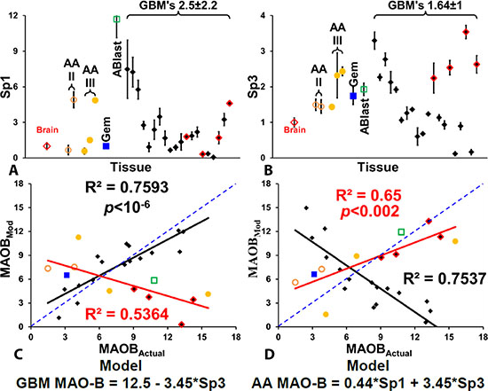 Figure 5: Quantification of Sp1 and Sp3 levels in gliomas. Relative levels of Sp1 (A) and Sp3 (B) in normal brain, five anaplastic astrocytomas, a geministic astrocytoma, an astroblastoma, and 16 GBM tumors, with the GBM tumors arranged from lowest to highest signal. In the case of Sp3 the four GBM that appear as outliners are indicated using red-lined diamond symbols. The modeling of the levels of MAOB, based on Sp1 and Sp3 levels is show for the 16 GBM in (C) and for the astrocytic-type glioma and 4 aberrant GBM in (D). All points are mean ± SD, with n = 4 for tumor samples and n = 12 for the control brain samples.