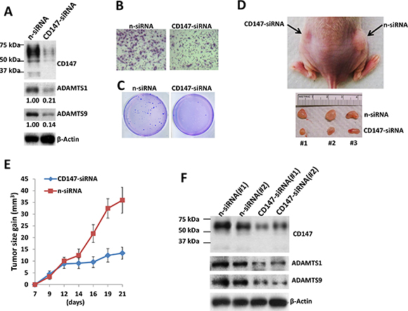 Since TIVE-LT cells displaying high CD147 expression, we found that silencing of CD147 by RNAi reduced the expression of ADAMTS1 and 9 (Figure 5A), as well as their transcripts (data not shown). Silencing of CD147 by RNAi significantly blocked TIVE-LT cell invasion and anchorage-independent growth, when compared to negative control siRNA (n-siRNA) group (Figure 5B–5C). We also observed long-term “knock-down” of CD147 expression by RNAi for at least 2 weeks in vitro culture (Supplementary Figure S5). Next, we injected TIVE-LT cells transfected with n-siRNA or CD147-siRNA subcutaneously into the right and left flanks of nude mice, respectively. These mice were observed and measured every 2~3 day for the presence of palpable tumors for 21 days. Our results indicated that silencing of CD147 significantly repressed tumor growth in nude mice. Mice injected with CD147-siRNA formed smaller tumors when compared to n-siRNA groups at 21 days (Figure 5D–5E). Immunoblot results confirmed the higher levels of CD147, ADAMTS1 and 9 expression in tumor lysates from mice with n-siRNA than those from mice with CD147-siRNA, demonstrating the successful silencing of CD147 and downstream ADAMTSs in vivo (Figure 5F). Our additional data indicated that direct silencing of ADAMTS1 by siRNA also significantly repressed tumor growth in nude mice (Supplementary Figure S6). Taken together, these data support the important role of CD147, ADAMTS1 and 9 as cellular co-factors for KSHV-related tumorigenicity and KS development.