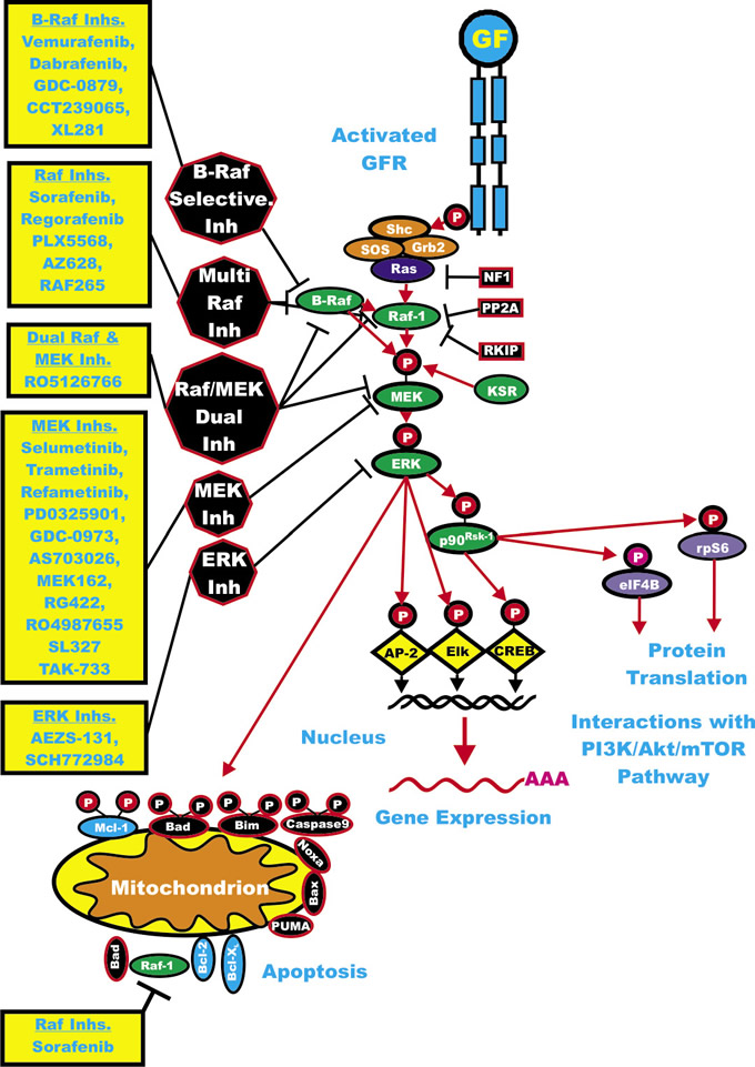 Figure 1: Overview of the Ras/Raf/MEK/ERK Cascade and Small Molecule Inhibitors Used for Targeting this Pathway. Activation of this pathway can occur by mutations in upstream growth factor receptors (GFR) or by stimulation by the appropriate growth factors (GF). In addition, mutations can occur in intrinsic members of the pathway (RAS RAF, MEK1 or the tumor suppressor Neurofibromin (NF1). GFR and GR are indicated in blue. Kinases are indicated in green ovals. Coupling molecules are indicated by orange ovals. The Ras molecule is indicated by a purple oval. Transcription factors are indicated by yellow diamonds. Sites where NF1, protein phosphatase 2A (PP2A) Raf kinase inhibitory protein (RKIP), kinase suppressor of Ras (KSR) interact with this pathway are on the right hand side of the Ras/Raf/MEK/ERK pathway. NF1, PP2A and RKIP are depicted in black rectangles as they normally serve to dampen the activity of this pathway. Molecules such as Mcl-1 which are anti-apoptotic and phosphorylated by ERK and Akt are indicated by blue ovals, other anti-apoptotic molecule are also indicated by blue ovals. Pro-apoptotic molecules are indicated by black ovals. Red arrows indicate activating events in pathways. Sites where various small molecule inhibitors function are in black octagons on the left hand side of the pathway. Representative inhibitors are listed in yellow boxes next to the octagons. Red arrows indicate activating events in pathways. Black arrows indicating inactivating events in pathway. Activating phosphorylation events are depicted in red circles with Ps with a black outlined circle. Inactivating phosphorylation events are depicted in black circles with Ps with a red outlined circle.