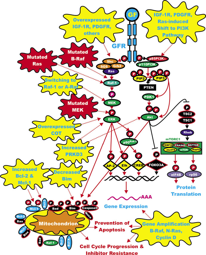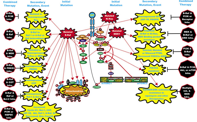 Figure 2: Sites of Mutations which can Result in Resistance to Raf and MEK Inhibitors. Sites of mutation which result in sensitivity to Raf and MEK inhibitors are indicated in red irregular circles. The same color scheme present in Figure 1 for other signaling molecules is continuted in this figure. Signaling induced by mutations is indicated by red dashed lines. Secondary mutation/events which result in inhibitor resistance are depicted in yellow irregular circle. Signaling induced by mutations is indicated by red dashed lines.