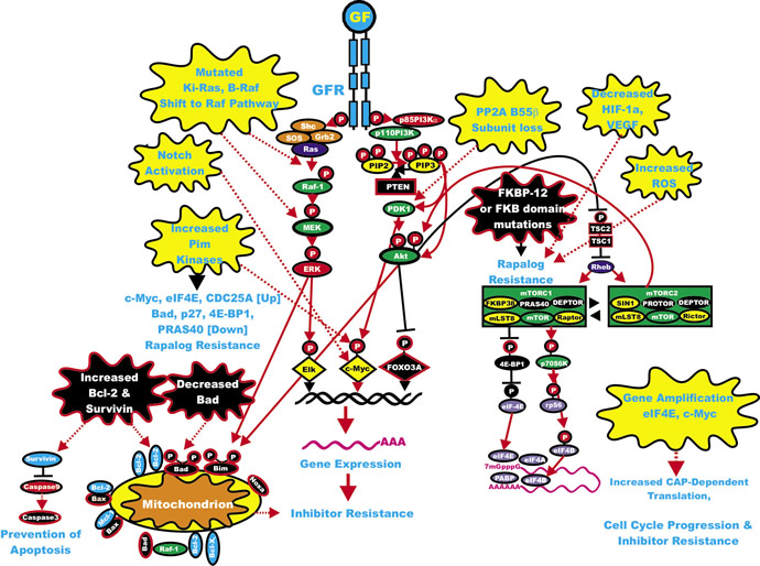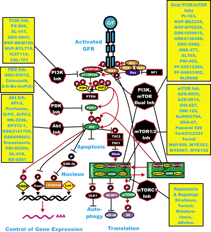Figure 3: Overview of the PI3K/Akt/mTOR Cascade and Small Molecule Inhibitors Used for Targeting this Pathway. Activation of this pathway can occur by mutations in upstream growth factor receptors (GFR) or by stimulation by the appropriate GF. In addition mutations can occur in intrinsic members of the pathway (RAS PIK3CA, AKT or the tumor suppressors (NF1, PTEN, TSC1, TSC2). Sites where NF1, PTEN, TSC1, TSC2 are depicted in black rectangles as they normally serve to dampen the activity of this pathway. An activated growth factor receptor is indicated in blue. Ras and Rheb are indicated in dark blue ovals. IRS1, SOS, Shc and Grb2 are indicated in orange ovals. Kinases are indicated in green ovals. The p85 regulatory subunit of PI3K is indicated in a red oval. Phosphatases are indicated in black octagons. NF1, TSC1 and TSC2 are indicated in black squares. PIP2 and PIP3 are indicated in yellow ovals. mTOR interacting proteins which positively regulate mTOR activity are indicated in yellor ovals. mTOR interacting proteins which negatively regulate mTOR activity are indicated in black ovals. Transcription factors activated by either ERK or Akt phosphorylation are indicated in yellow diamonds. The Foxo transcription factor that is inactivated by Akt phosphorylation is indicated by a black diamond. β-catenin is indicated in an orange rectangle. mRNA initiation factors and proteins associated with the ribosome are indicated in purple ovals. mTORC1 phosphorylates the unc-51-like kinase 1 (ULK1) which results in the suppression of autophagy. ULK1 is indicated in a black oval. The mTORC1 inhibitor prevents phosphorylation of ULK1 and autophagy can occur. Sites where various small molecule inhibitors function are in black octagons. Representative inhibitors are listed in boxes in yellow next to the octagons. Red arrows indicate activating events in pathways. Black arrows indicating inactivating events in pathway. Activating phosphorylation events are depicted in red circles with Ps with a black outlined circle. Inactivating phosphorylation events are depicted in black circles with Ps with a red outlined circle.