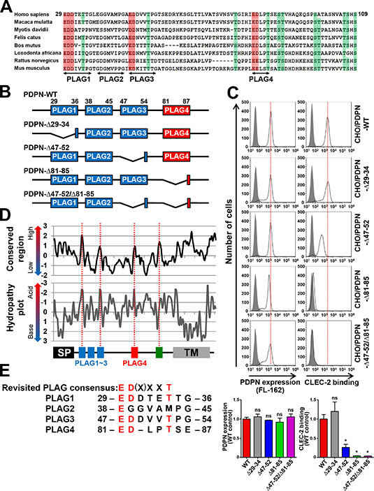 Figure 1: Identification of a new CLEC-2-binding domain, PLAG4, highly conserved in mammals. (A) Eight mammalian podoplanin protein sequences were aligned. Half-tone meshing area indicates over 80% conserved residues (Red: Asp or Glu, Green: Thr or Ser). The gaps against the Homo sapiens podoplanin found in multi-aligned sequences were deleted to show the alignment concisely. The deleted gaps in each sequence of species are followed. Macaca mulatta (XP_001106933.2), not deleted; Myotis davidii (XP_006766770.1), ΔA129; Bos mutus (XP_005889851.1), ΔP100-P112; Felis catus (XP_006934362.1), ΔT63; Loxodonta africana (XP_010591406.1), ΔT63 and ΔH92; Rattus norvegicus (NP_062231.1), ΔT63; and Mus musculus (NP_034459.2), ΔT63. (B) Schematic representation of human PLAG domain-deleted mutants used in this study. (C) CHO cells that had been stably transfected with PDPN-WT or PLAG domain-deleted PDPN mutants were treated with control rabbit IgG (closed areas) or anti-PDPN pAb (FL162; open areas) for measuring PDPN expression levels (upper left panels), or with PBS (closed areas) or CLEC-2-(His)10 (open areas) for estimating CLEC-2-binding ability (upper right panels). After washing, cells were incubated with Alexa Flour 488-conjugated second antibody. The flow cytometry data (upper) and their quantitative graphs (lower) are shown. Each value in the lower graphs indicates mean ± SDs (N = 3) of the peak values normalized by that of PDPN-WT/CHO. *P < 0.05 using Mann–Whitney U test. ns, not significant. (D) Sliding-window analysis and hydropathy analysis were performed using data from 42 mammalian species (window size equals three or two amino acids, respectively). Four highly conserved regions within the extracellular domains are indicated by red dotted lines. (E) Human PLAG1–4 domains were aligned with the revised PLAG consensus sequence ED(X)XXT.