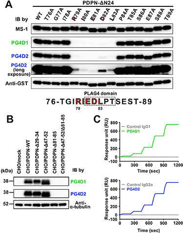 Figure 3: Establishment of PLAG4 domain-recognizing anti-podoplanin-neutralizing mAbs. (A) GST-tagged recombinant human ΔN24-podoplanin protein (WT) and its point mutants were expressed in E. coli. Cell lysates were electrophoresed and immunoblotted with antibodies to podoplanin (MS-1, PG4D1, and PG4D2) or GST. In the fourth panel, the image of PG4D2 immunoblotting after long exposure is shown. The predicted PG4D1 and PG4D2 mAb-recognition domain (79-RIEDL-83) is indicated by red bold letters. (B) CHO cells that had been stably transfected with empty vector (mock), PDPN-WT, or PLAG domain-deleted PDPN mutants were lysed and immunoblotted with antibodies to podoplanin (PG4D1 and PG4D2) or α-tubulin. (C) Interaction between the human podoplanin protein immobilized on the CM-5 tip and control IgG1 (gray line, upper graph), the PG4D1 mAb (green line, upper graph), control IgG2a (gray line, lower graph), or the PG4D2 mAb (blue line, lower graph) was estimated by SPR analysis. Equilibrium dissociation constants (KD) of PG4D1 or PG4D2 mAbs on human podoplanin could not be calculated.