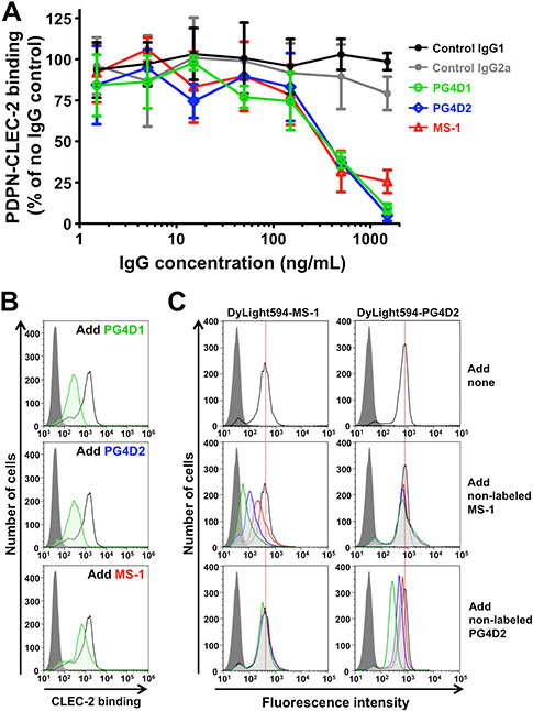 Figure 4: Neutralization of podoplanin–CLEC-2 binding by anti-PLAG4 mAbs PG4D1 and PG4D2. (A) Podoplanin-Fc protein (1 ng/well) was incubated with the indicated concentrations of control or anti-podoplanin antibodies in a 96-well plate. Next, CLEC-2-(His)10 protein (30 ng/well) was added to each well. After incubation with alpha screen beads, podoplanin-CLEC-2 binding intensity was measured as a fluorescence signal. No IgG control was taken as 100%. The graph shows mean ± SDs (N = 3). (B) CHO/PDPN-WT cells were incubated with 100 µg/mL of control IgG1/IgG2a or anti-podoplanin (PG4D1, PG4D2, or MS-1) antibodies, followed by incubation with 0.4 μg/mL of CLEC-2-(His)10 protein (open areas: control IgG-treated samples; green areas: PG4D1-, PG4D2-, or MS-1-treated samples). After washing, cells were further incubated with Alexa Flour 488-conjugated anti-penta-His second antibody. CLEC-2 binding was measured by flow cytometry. Grey areas indicate the fluorescence intensity of CLEC-2-non-treated samples. (C) CHO/PDPN-WT cells were incubated with 10 μg/mL of DyLight594-conjugated MS-1 or PG4D2 mAb (top panels). In some experiments, cold MS-1 or PG4D2 mAb (green areas: 10 μg/mL; blue areas: 3 μg/mL; red areas: 1 μg/mL) were co-treated with 10 μg/mL of DyLight594-conjugated antibodies (middle and bottom panels). After washing, fluorescence intensity was measured by flow cytometry.