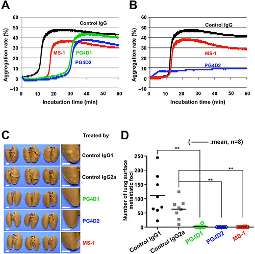 Figure 5: Inhibition of podoplanin-mediated platelet aggregation and pulmonary metastasis by anti-PLAG4 mAbs PG4D1 and PG4D2. (A and B) CHO/PDPN-WT cells (A) or CHO/PDPN-D48A cells (B) were incubated with 10 μg/mL of the indicated antibodies followed by incubation with mouse PRP. The aggregation rate was estimated using an aggregometer. (C and D) BALB/c-nu/nu mice were intravenously injected with 10 μg/mouse of the indicated antibodies. The next day, CHO/PDPN-WT cells (2.5 × 105 cells/mouse) were intravenously inoculated into the mice. After 19 days of tumor inoculation, the mice were euthanized, and lung surface metastatic foci were counted. The representative pictures of lungs are shown (C). Areas surrounded by boxes are magnified (right pictures). Bars, 2 mm. The number of metastatic foci is shown (D). Bars, mean (N = 8). **P < 0.01 using the Mann–Whitney U test.